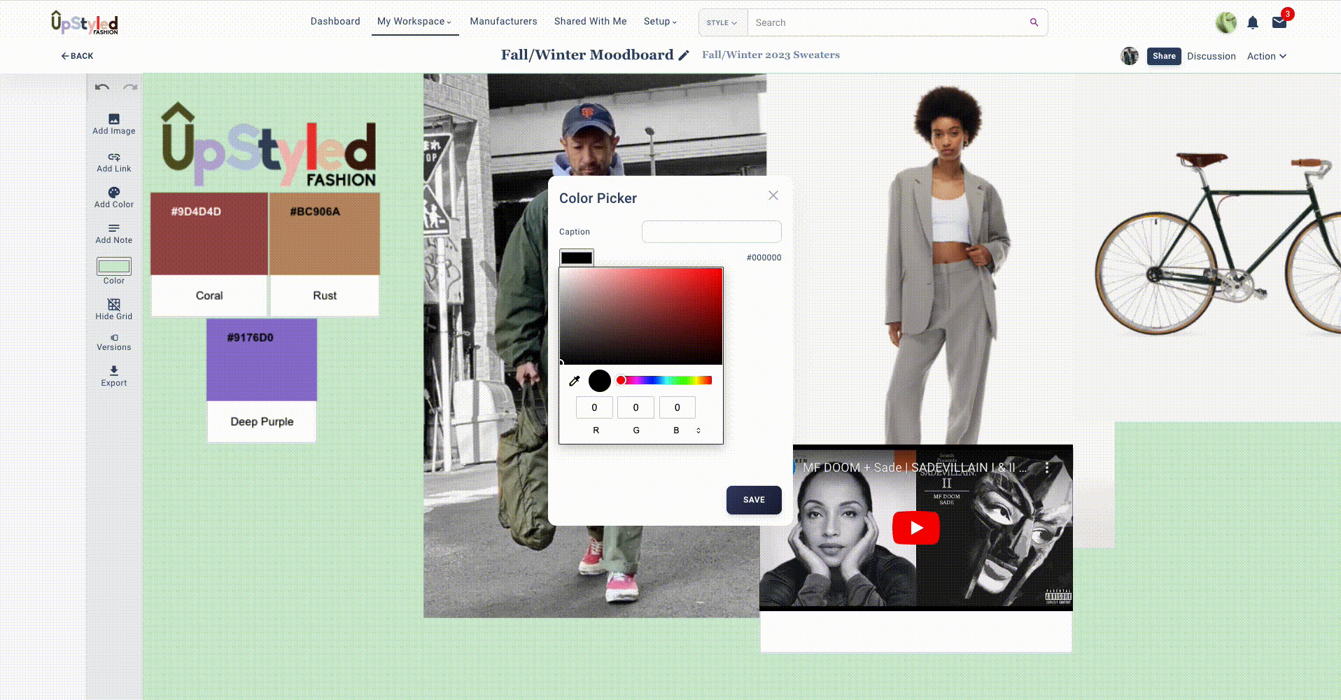 The Color Master is a convenient way to save, manage, and control a variety of colors that you plan to use throughout your design process. You can store specific colors in your Color Master, to be conveniently pulled out at any time. 1. To access your Color Master, go to your Setup located in the top menubar 2. Click the “CREATE NEW COLOR” button located on the top left corner of your Color Master 3. Click on the black square to pick your color. You can use any one of our tools to choose your color, including the Color Code, Color Slider, Color Picker, etc. 4. Fill in your specific color information to keep track of the exact shade you’re looking to reference 5. Click “CREATE” to save this color to your Color Master.