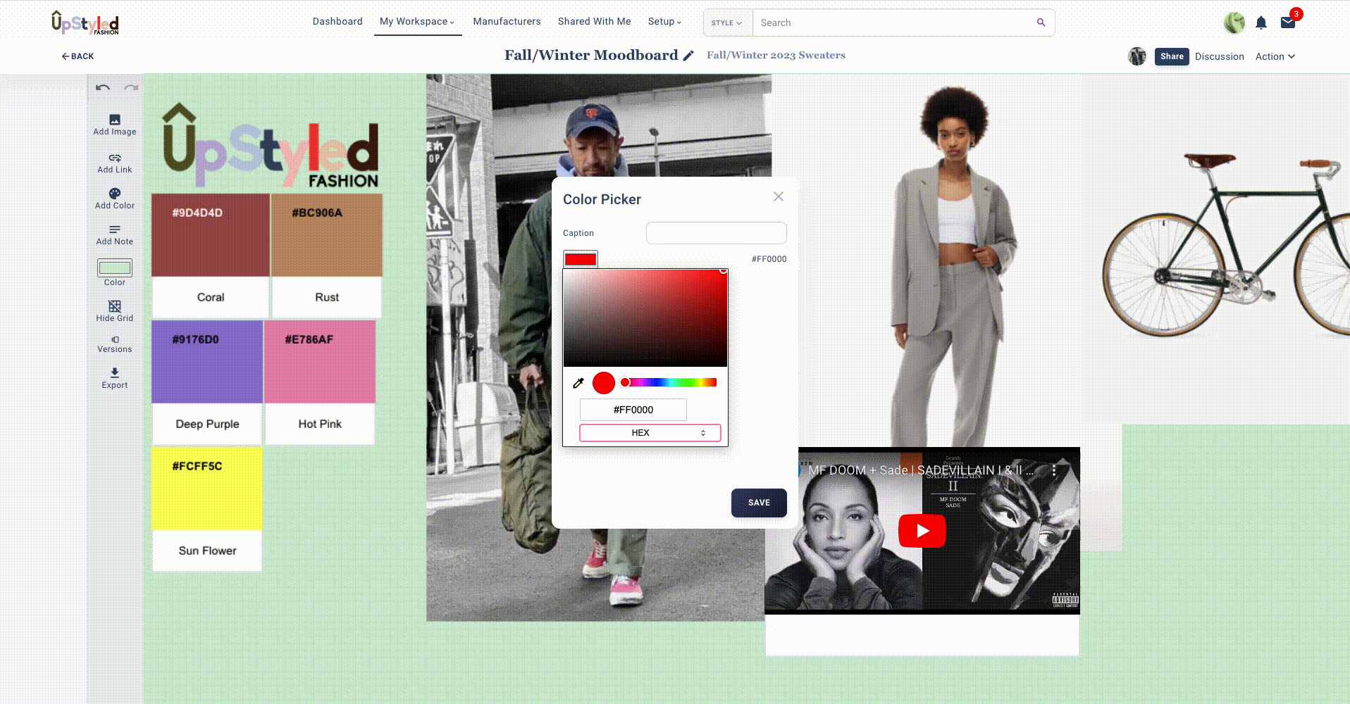 Adding colors is a simple, yet effective component to any great Moodboard! To add a color, just click “Add Color” on your toolbar found on the left hand side of your Moodboard.