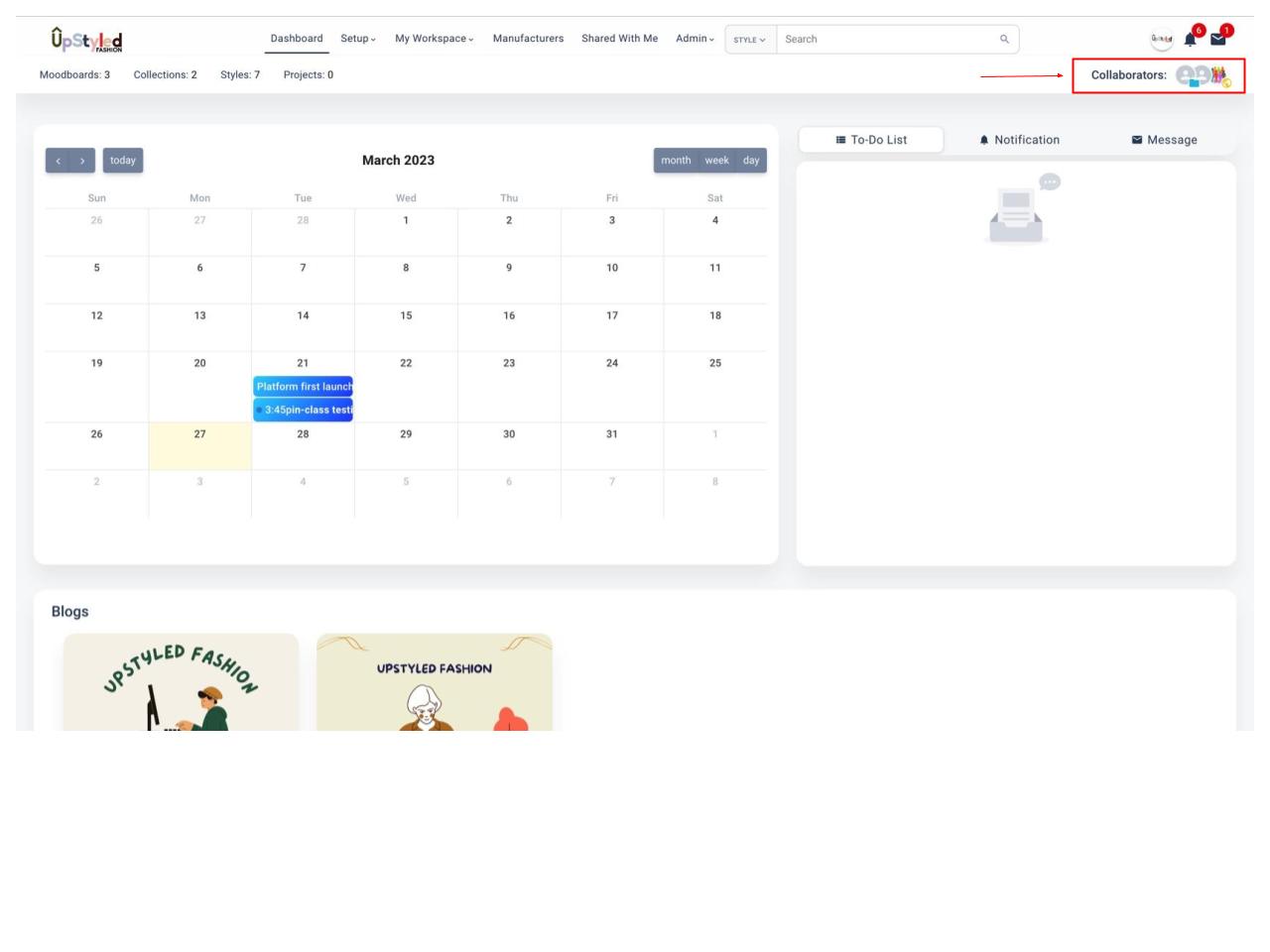 Use the upper textbox to invite users that are already using UpStyled Fashion. If you’d like to collaborate with new users who are not already UpStyled Fashion members, you can type invite them via email using the bottom textbox