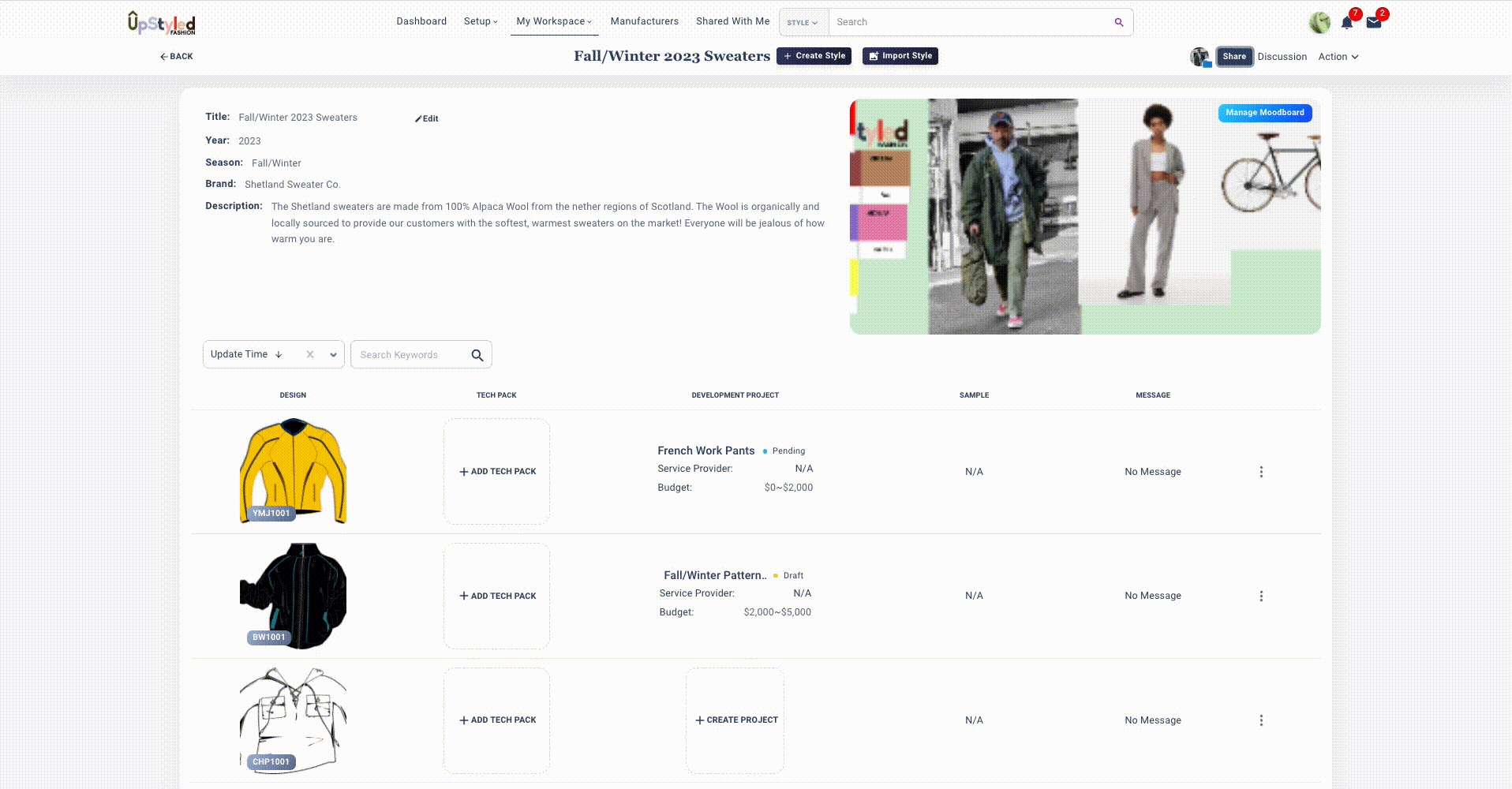 UpStyled Fashion allows you to share Moodboards, Collections, Styles, and Tech Packs with your creative peers, or design team, to collaborate in real time.